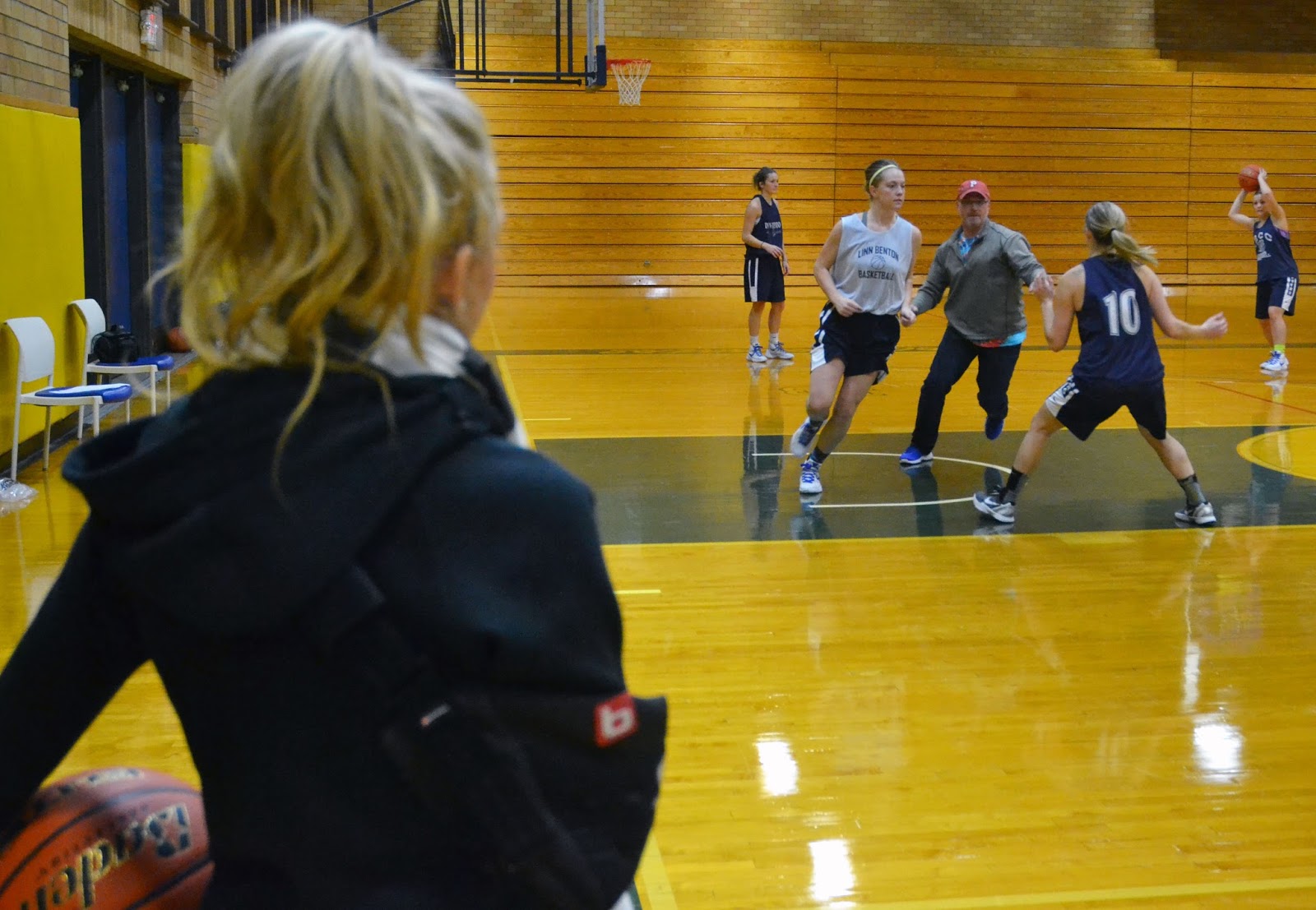| Courtney Landis looks on as Jerry Coe works on defense with Nicole Magnisun and Hannah Creswick |